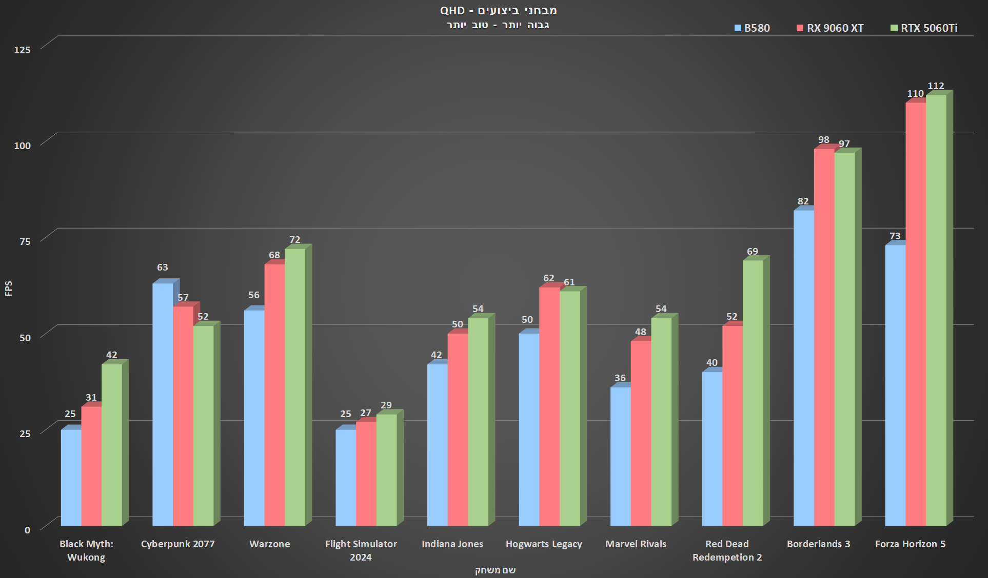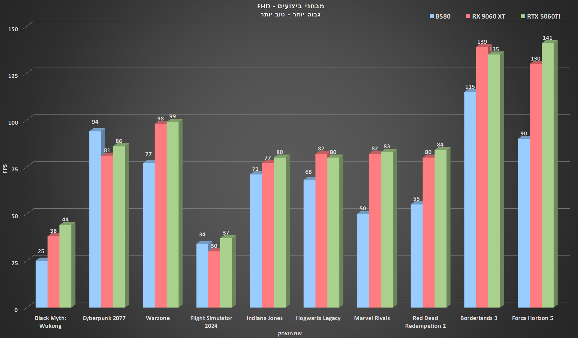 כמו תמיד ועל מנת לבדוק את ביצועי הגיימינג של ה-B580, הרצתי עליו 10 משחקים פופלאריים ותובעניים כשרובם בנויים על מנועי משחק שונים כדי לבדוק את כוחו האמיתי של הכרטיס. בכל משחק לקחתי את כל ההגדרות הגרפיות עד לקצה העליון, ביטלתי את ה-Ray Tracing, XeSS וה-Motion Blur ובדקתי את הביצועים ברזולוציית FHD שכן זאת עדיין הרזולוציה הנפוצה ביותר ועל רזולוציית QHD מפני שאלו רזולוציות היעד של הכרטיס. את הביצועים השוואתי לכרטיסים שנמצאים יחסית קרובים לקטגוריית המחיר והביצועים.