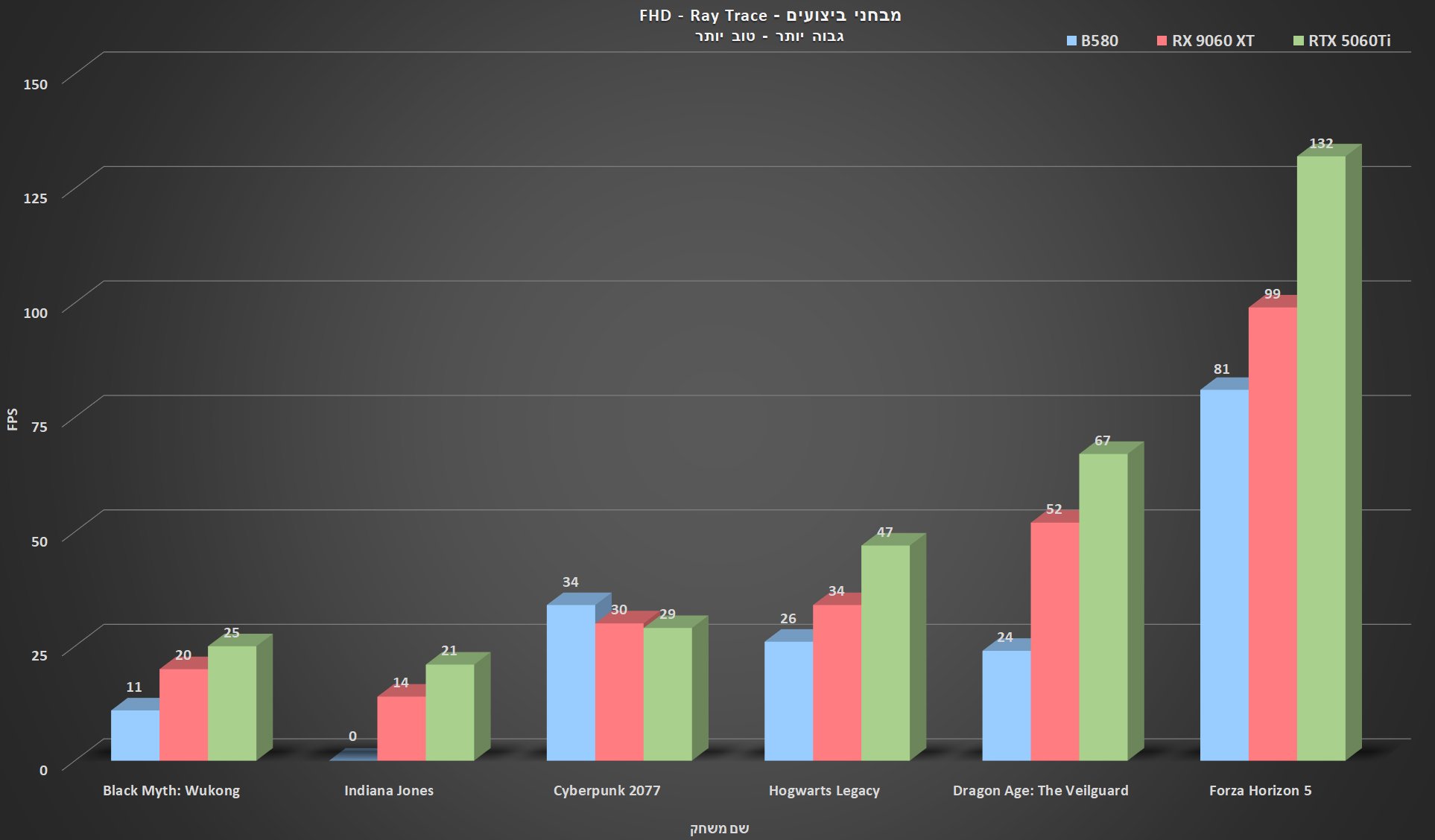 אחרי שראינו את הביצועים של המשחקים הרגילים, אני בטוח שמה שאנחנו רואים פה לא מפתיע אף אחד. היום כבר אפשר להגיד, לעשות Ray Tracing בגיימינג זאת סוג של אומנות, Nvidia המציאה את התחום, AMD למדה לעשות את זה בשנים האחרונות ואינטל רק עכשיו מתחילה ללמוד ועושה את צעדיה הראשונים. אם נתמקד במשחקים לרגע נוכל לראות שרובם לא מגיעים לקצב FPS שמספיק למשחק ועם Indiana Jones המשחק אפילו לא הצליח לרוץ, בעיקר בשל כמות הזיכרון הגרפית היחסית נמוכה של הכרטיס, בעיה שראינו גם עם ה-RTX 5070. כמו שאפשר לראות, אינטל מתחילה ללכת אבל השאר כבר התחילו לרוץ.