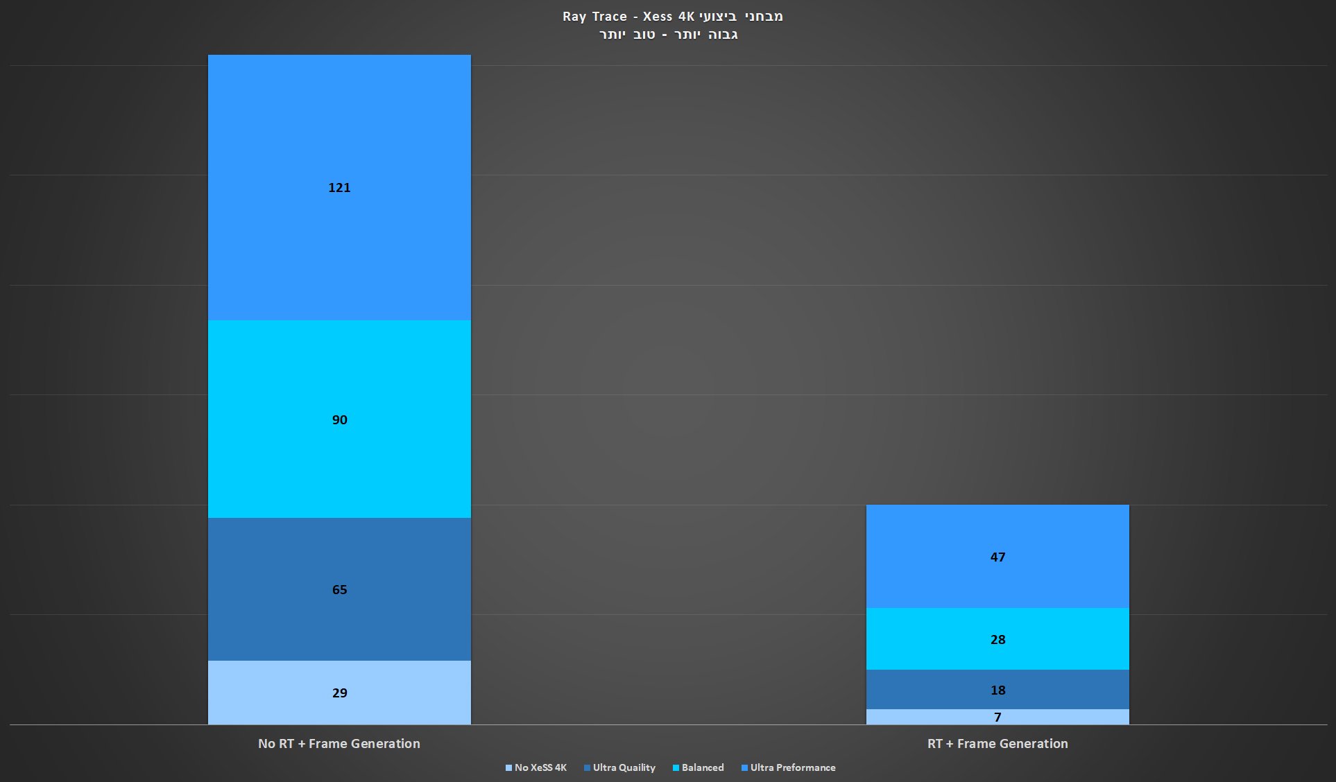 בעוד שהביצועים "הקלאסיים" של הכרטיס היו ככה-ככה בלשון המעטה, בהפעלה של XeSS אנחנו רואים שיפור ביצועים נהדר שמעניק לכרטיס יכולת לשחק גם ברזולוציית 4K, רזולוציה שרחוקה מאוד מייעודו של הכרטיס או לשחק עם Ray Tracing פועל. הקפיצה בביצועים היא דרמטית כל כך שממצב של 7FPS בודדים אפשר להגיע לקצב יחסית חלק של 47FPS עם וויתור יחסית לא גדול על איכות התמונה, במשחק ללא Ray Tracing אנחנו רואים קפיצה מרף ה-30FPS המינימאלי לכדי מעל ל-60FPS במצב ששם דגש על איכות תמונה או מעל 120FPS במידה ואתם רוצים כל פריים אפשרי שאפשר לסחוט מהכרטיס.