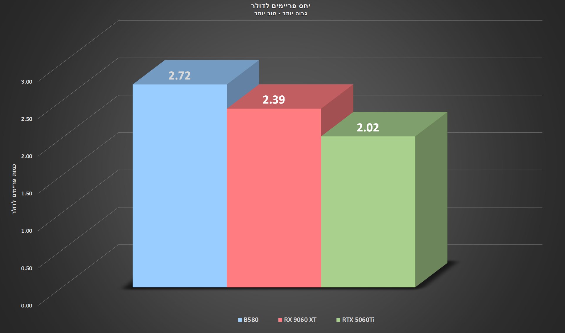 ככרטיס שמיועד לשוק הביניים ומטה, ה-B580 צריך לבלוט במדד אחד בעיקר, מדד התמורה לכסף (Value for Money). וכפי שאפשר לראות מגרפי הביצועים הכרטיס מפגר מאחור ולכן הקרב על הכיס זאת הזירה המרכזית שלו. כדי להסתכל על המדד הזה סכמתי את כמות הפריימים שכל כרטיס השיג ברזולוציית 1080p במשחקים השונים וחילקתי את הסכום במחיר ה-MSRP של הכרטיס על מנת לקבל את יחס הפריימים לדולר שמקבלים.