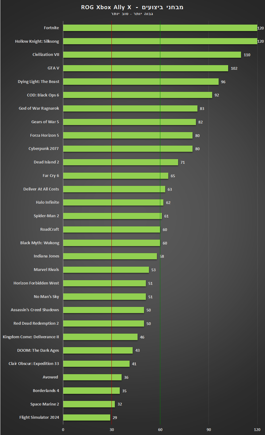 הקו האדום על הגרף מציין את רף ה-30FPS שנחשב מבחינתי כמינימום למשחק כאשר כל משחק שנמצא מצד שמאל אליו ״נכשל״ במבחן הבדיקות ולמעשה לא שחיק. כמו שאפשר לראות, לשמחתי היה רק משחק חדש שלא הצליח לחצות את הקו ה-30FPS וזה Flight Simulator 2024 הטובעני. הקו הירוק מציין את רף 60FPS שאני מגדיר כרף התחתון למשחק חלק ונעים במיוחד, כאן אפשר לראות כי מחצית מהמשחקים שבדקתי עברו את ממוצע ה-60FPS יחד עם עוד שני משחקים (RoadCraft ו-Black Myth: Wukong) שיושבים בדיוק בנקודת ה-60. בסך הכל מדובר כאן על ביצועים טובים, אפילו טובים מאוד (ממוצע של 66FPS על פני כל המשחקים) שמאפשרים להריץ פחות או יותר כל משחק מתי ואיפה שרק תרצו. בנוסף, יכול להיות שהביצועים עוד יתשפרו בכמה אחוזים בבודדים בחודשים הקרובים עם עידכוני תוכנה ואופטימיזציה וגם משחקים שנמצאים מתחת לרף ה-60 יוכלו לחצות אותו או להתקרב אליו יותר. משחק נוסף שבדקתי ולא מופיע כאן בגרף הוא EA Sports FC 26 שפשוט לא הצליח לרוץ על הקונסולה וקרס פעם אחרי פעם. זה מקרה נקודתי מאוד ולכן אני חושב שמדובר יותר על בעיה בצד המשחק אבל כן חשוב לי לציין את זה.