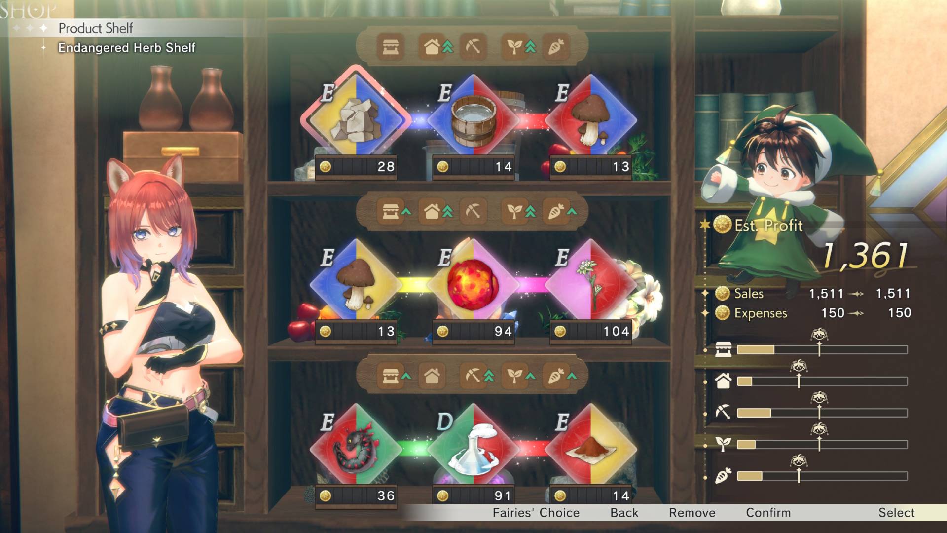 עכשיו שאני גם מזכיר גם את האלכימיה, בואו נדבר על מכניקת האלכימיה שהיא אמורה להיות הלחם והחמאה של המשחק הזה - גם פה, המערכת מופשטת יותר משהיא היתה ב-Yumia והפעם אולי דווקא מדובר דווקא בפלוס עבור המשחק הזה, אבל ככל שנתקדם, נאסוף יותר מתכונים שנוכל להשתמש בהם על מנת ליצור דברים חדשים, כשלכל מתכון יש מספר מדויק של משאבים שאותם נצטרך על מנת ליצור דבר מה חדש ותו לא, הצורה שבה ניתן לתת ליצירות שלנו עוד בוסט הוא בעזרת מכאניקת צבעים, לכל משאב יש שני צבעים ואם השחקן יתאים צבעים של משאבים אחד עם השני, יהיה ניתן לקבל בוסט עם האלכימיה וככה שיקויי ריפוי ופצצות יהפכו לחזקים יותר.