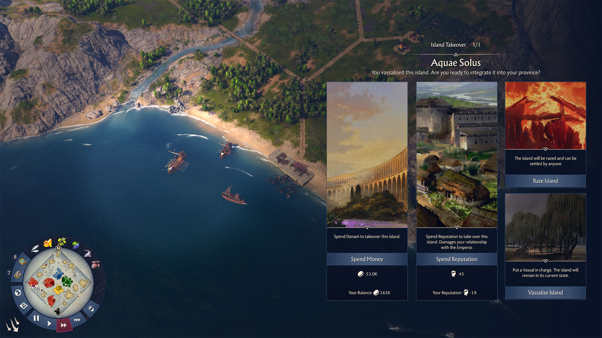 אבל עכשיו הגענו לבעיה הכי גדולה שלי במשחק והאחת שגם ללא ספק גרמה לי להכי הרבה עצבים איתו - השילוב בין Latium ו-Albion. אני אתחיל ואומר, הרעיון הזה מעולה, היכולת לשלב בין שתי "עולמות" שונים שבכל אחד מהם יש למעשה משחק אחר שחי ומתקדם בזמן אמת עם אויבים שונים, משאבים ואנשים שונים היא מעניינת מאוד ומספקת אתגר נוסף ועמוק למשחקיות לעומת כל אחד מהם בנפרד. אבל וזה אבל ענק, השילוב בין העולמות עשוי בצורה לא טובה בכלל. אם למשל אחת הספינות שלכם מותקפת - לחיצה על ההתראה שתבשר על כך תקפיץ אותה אליכם, הבעיה היא שאם אתם כרגע ב-Albion והספינה המותקפת היא ב-Latium זה יעביר אתכם בין המחוזות עם מסך טעינה של כמה שניות בין לבין. כך באשר לכל התראה שתקפוץ (וקופצות לא מעט) שלא אומרת לאיזה מחוז היא רלוונטית ופשוט תנתק אתכם מאיפה שאתם נמצאים עכשיו ותכריח אתכם לדלג למחוז הבא דרך מסך טעינה. אחרי לא מעט דילוגים אחורה וקדימה כאלה נאלצתי לוותר בייאוש על הניסיון לתת מענה לכל ההתראות והייתי עובר בין המחוזות מתי שהייתי זוכר לעשות כן כדי לגלות שקרו שינויים בזמן שלא הייתי ולא בהכרח היה לי שליטה עליהם. בכנות, הייתי מעדיף לקבל את האופציה ששני המחוזות היו מחוברים או לבחור לשחק במחוז אחד בלבד על פני ההתפרסות על שני המחוזות.