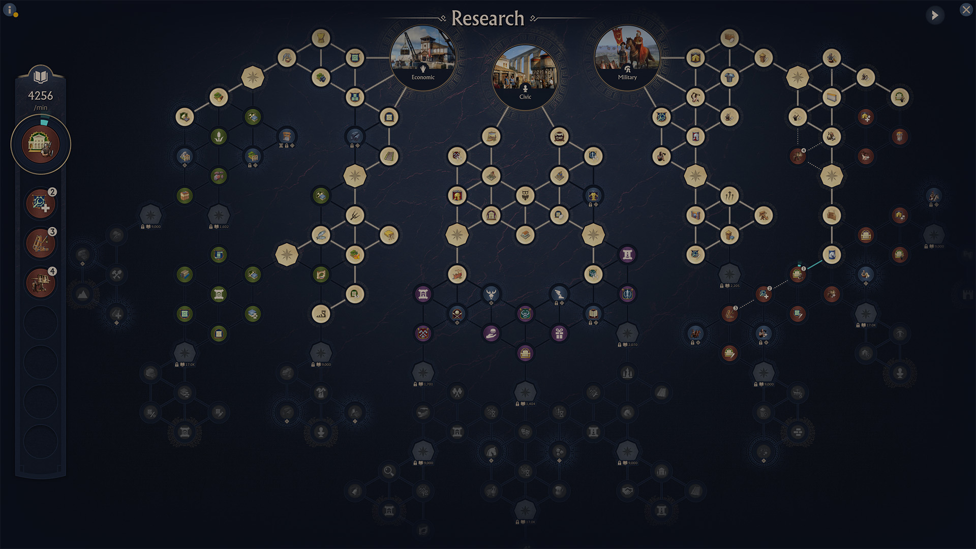 המערכת האחרונה המרכזית שמשחקת כאן תפקיד ולא דיברתי עליה זאת מערכת המחקר שתפתח עוד יכולות ופריטים חדשים עבורנו. גם כאן, מדובר על מערכת פשוטה שמבוססת נקודות מחקר שיופקו על בסיס האוכלוסיה שבעלת גישה למבנה מחקר, המערכת מקבלת את העומק שלה דווקא מהאופציות המחקר השונות. עץ המחקר של המשחק הוא לא פחות מעצום ומלא באופציות שמחולקות לשלוש קטגוריות שונות: כלכלה, צבא וחברה כאשר כל אחת מהאופציות האלה מתחלקת לעוד תתי-עצי מחקר. את חלק מהמחקרים אפשר לבצע על ידי השקעה של נקודות מחקר בלבד, בעוד אחרים ידרשו מכם גם לבצע כל מיני פעולות בעולם המשחק (כמו להגדיל את הצבא ל-5 יחידות) כדי לפתוח את האפשרות לחקור אותן. על אף העומס העצום שהכה לי בפרצוף בפעם הראשונה שראיתי את עצי המחקר, אני אוהב את האופציות שמאפשרות לשחקן להתאים את המחקר והשידרוגים שהוא עובד עליהם לצורת המשחק ואפילו המחוז שבו הוא משחק.