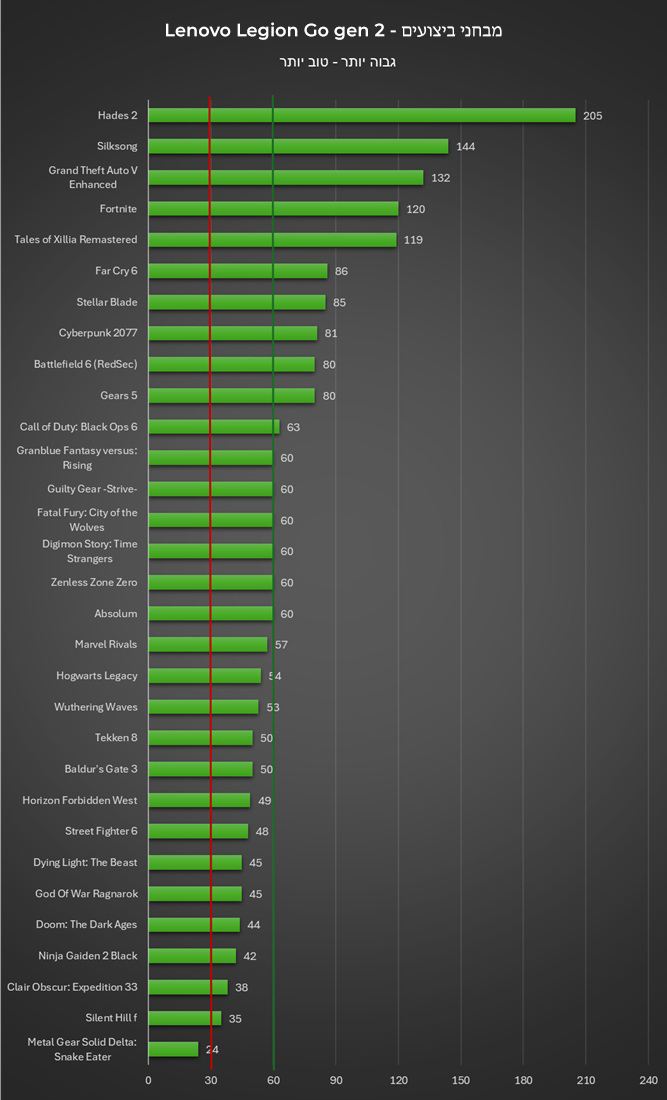 בלי יותר מדי הקדמה לכך, הנה המספרים של קצת יותר מ-30 משחקים שהרצתי על המכשיר. את המשחקים העברתי למצב גרפי Medium, כיביתי את ה-Ray Tracing, מצב האפסקיילינג היה Medium היכן שיכולתי להגדיר אותו והפעלתי גם את טכנולוגיית ה-Frame Gen של AMD ואת הקונסולה העברתי למצב ביצועים, התוצאות כפי שאתם יכולים לראות לא רעות בכלל: