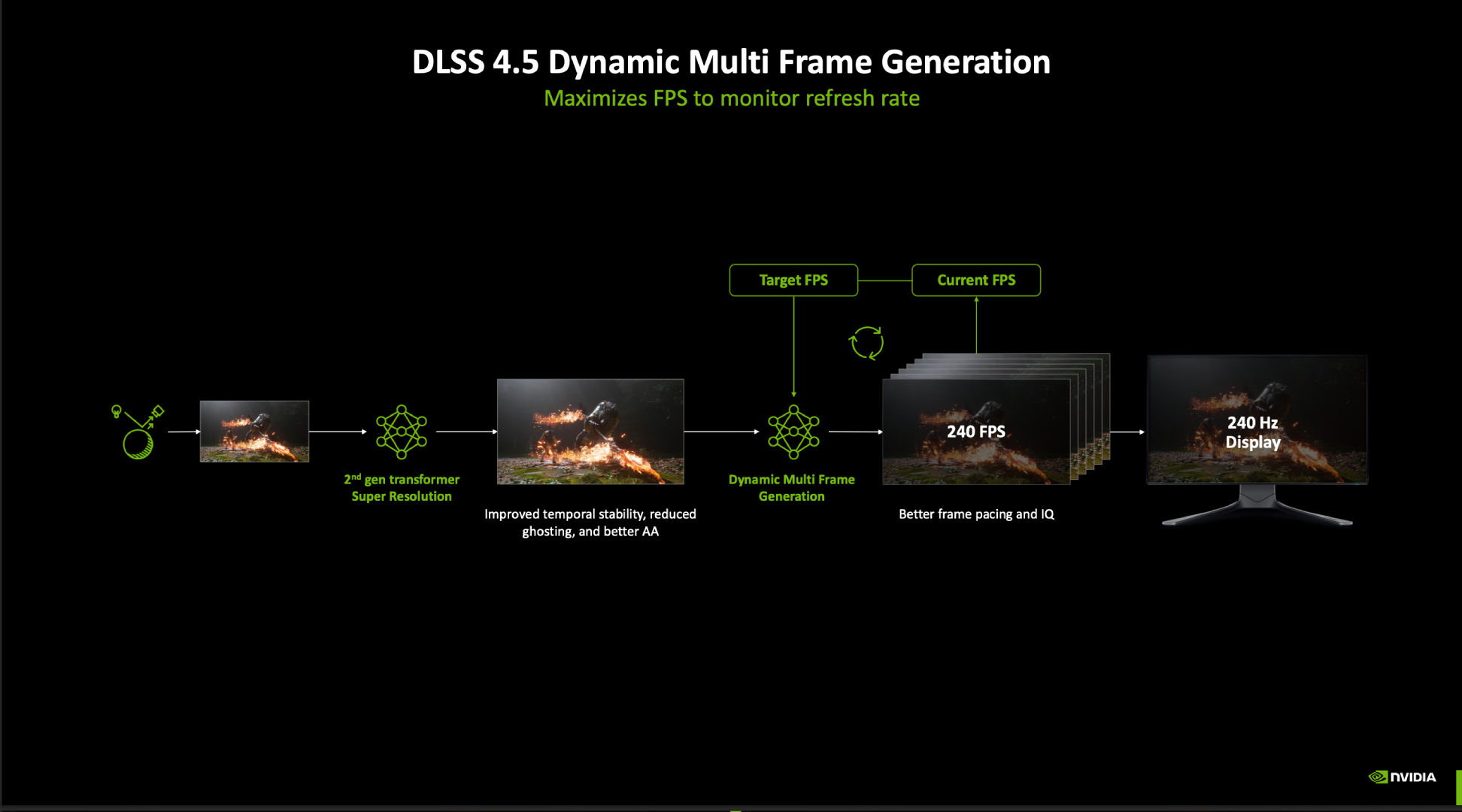 הראשונה היא כמובן DLSS שהפכה להיות אחת הטכנולוגיות האהובות ביותר של החברה כשהיא גם מקדישה לה משאבים רבים ודואגת לטפח ולעדכן אותה באופן רציף. בשנה שעברה קיבלנו את DLSS 4 ועכשיו אנחנו מקבלים את DLSS 4.5 שלוקחת את כל מה שהוצג אז ועושה את זה טוב יותר. אחד החידושים המרכזיים של DLSS 4.5 זאת היכולת ליצור עד חמישה פריימים על כל פריים אמיתי בעזרת בינה מלאכותית, שיפור לעומת השלושה שהיו אפשריים עד כה שאמור לספק משחק ב-4K 240Hz. בנוסף לכך קיבלנו דור שני למודל DLSS Super Resolution שמשפר גם כן את האיכות הויזואלית של אותם הפריימים שנוצרו בעזרת DLSS.